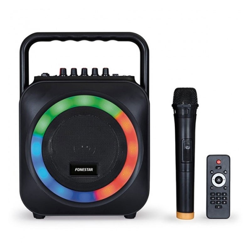 Fonestar BOX-35LED. Potencia estimada RMS: 35 W, Control de volumen: Giratorio. Micrófono: Inalámbrico. Tarjetas de memoria compatibles: MicroSD (TransFlash). Auriculares: 3,5 mm. Tipo de visualizador: Analógica, Color de luz de fondo: Ámbar