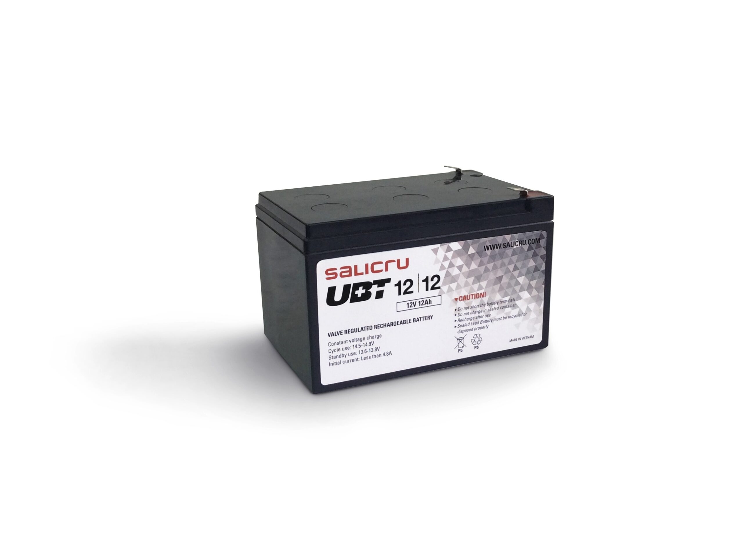 Salicru UBT 12/12 Batería AGM recargable de 12 Ah / 12 V. Tecnología de batería: Sealed Lead Acid (VRLA), Capacidad de la batería: 12 Ah, Voltaje de la pila: 12 V. Color del producto: Negro. Certificación: CE, WEEE. Peso: 3,67 kg, Ancho: 98 mm, Altura: 95 mm. Número de baterías incluidas: 1 pieza(s)
