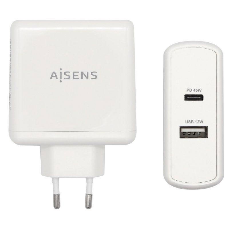 AISENS Cargador 57 W, 1x USB-C PD3.0 45 W, 1x USB-A 5 V / 2.4 A 12 W, Blanco. Tipo de cargador: Interior, Alimentación: Corriente alterna, Compatibilidad del cargador: GPS, Mando para videojuegos, MP3, MP4, Teléfono móvil, Portátil, Smartphone, Tableta. Voltaje de entrada: 100 – 240 V, Voltaje de salida máximo: 20 V. Cantidad de puertos USB 2.0: 1, Número de puertos USB Tipo C: 1, Carga rápida, Funciones de protección de poder: Sobrecarga, Cortocircuito. Color del producto: Blanco