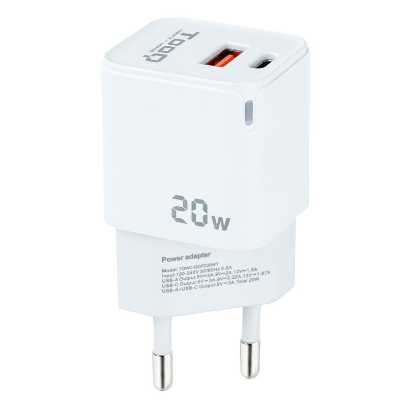 TooQ Cargador de Pared USB-C/PD + USB-A/QC 20W, Blanco. Tipo de cargador: Interior, Alimentación: Corriente alterna, Compatibilidad del cargador: Universal. Voltaje de entrada: 100-240 V. Cantidad de puertos USB 2.0: 1, Número de puertos USB Tipo C: 1, Carga rápida. Color del producto: Blanco