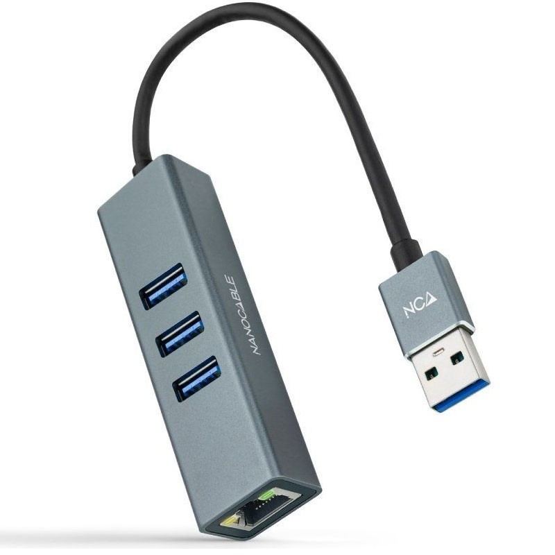 Nanocable Conversor USB 3.0 a Ethernet Gigabit + 3XUSB 3.0, Aluminio, Gris, 15 cm. Tecnología de conectividad: Alámbrico, Interfaz de host: USB 3.2 Gen 1 (3.1 Gen 1) Type-A. Ethernet LAN, velocidad de transferencia de datos: 10,100,1000 Mbit/s, Estándares de red: IEEE 802.3, IEEE 802.3ab, IEEE 802.3u. Color del producto: Gris, Material de la carcasa: Aluminio. Longitud del cable: 0,15 m. Sistema operativo Windows soportado: Windows 10, Windows 7, Windows 8, Windows 8.1, Sistema operativo MAC soportado: Mac OS X 10.0 Cheetah, Mac OS X 10.1 Puma, Mac OS X 10.10 Yosemite, Mac OS X 10.11 El Capitan, Mac…
