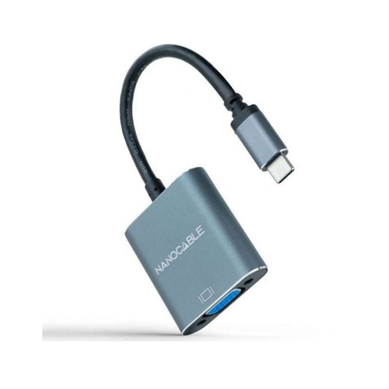 Nanocable Conversor USB-C a VGA, USB-C/M-VGA/H, Aluminio, Gris, 10 cm. Versión USB: 3.2 Gen 1 (3.1 Gen 1), Conector USB: USB Tipo C, Género del conector USB: Macho. Color del producto: Gris, Material de la carcasa: Aluminio, Longitud del cable USB: 0,1 m. Ancho: 42 mm, Profundidad: 45 mm, Altura: 14 mm