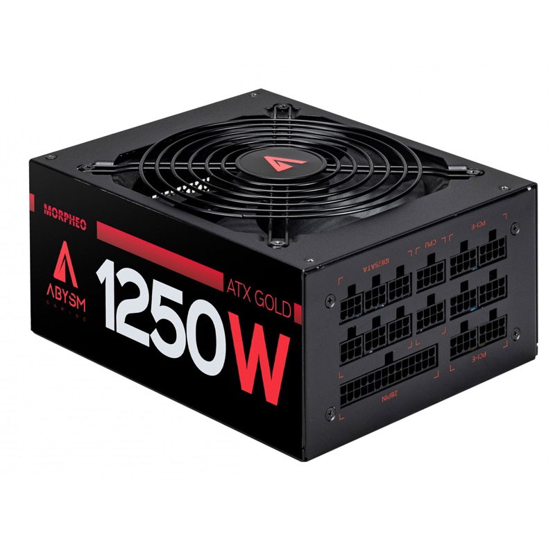 ABYSM Morpheo ATX 1250W Full Modular. Potencia total: 1250 W, Voltaje de entrada AC: 110 – 240 V, Corrección del factor de potencia tipo (PFC): Activo. Utilizar con: PC, Factor de forma de fuente de alimentación (PSU): ATX, Certificación 80 PLUS: 80 PLUS Gold. Color del producto: Negro, Tipo de enfriamiento: Activo, Diámetro de ventilador: 14 cm. Ancho: 150 mm, Profundidad: 180 mm, Altura: 85 mm. Ancho del paquete: 200 mm, Profundidad del paquete: 125 mm, Altura del paquete: 350 mm