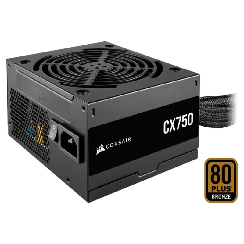 Corsair CX Series CX750. Potencia total: 750 W, Voltaje de entrada AC: 100 – 240 V, Frecuencia de entrada AC: 47 – 63 Hz. Alimentador de energía para tarjeta madre: 24-pin ATX, Longitud del cable de alimentación de la placa base: 60 cm. Utilizar con: PC, Factor de forma de fuente de alimentación (PSU): ATX, Certificación 80 PLUS: 80 PLUS Bronze. Color del producto: Negro, Tipo de enfriamiento: Activo, Diámetro de ventilador: 12 cm. Ancho: 150 mm, Profundidad: 125 mm