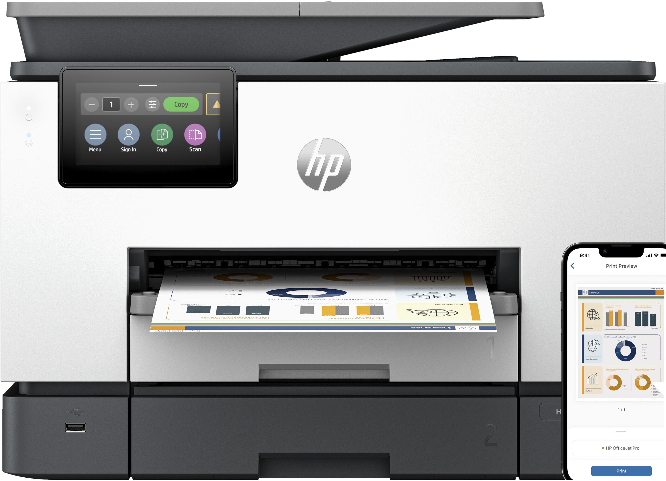 HP OfficeJet Pro Impresora multifunción 9130b, Color, Impresora para Pequeñas y medianas empresas, Imprima, copie, escanee y envíe por fax, Conexión inalámbrica; Impresión desde móvil o tablet; Alimentador automático de documentos; Impresión a doble cara; Escaneado a doble cara; Escanear a correo electrónico; Escanear a PDF; Fax; Puerto frontal de unidad flash USB; Pantalla táctil. Tecnología de impresión: Inyección de tinta térmica, Impresión: Impresión a color, Resolución máxima: 4800 x 1200 DPI, Velocidad de impresión (color, calidad normal, A4/US Carta): 19 ppm. Copiando: Copia a color, Resolución máxima de copia: 600 x 600 DPI. Escaneando: Escaneo a color, Resolución óptica de escáner: 1200 x 1200 DPI. Enviando por fax: Fax a color. Funciones dúplex: Imprimir, Escanear, Fax. Tamaño máximo de papel ISO A-series: A4. Wifi. Impresión directa. Color del producto: Gris