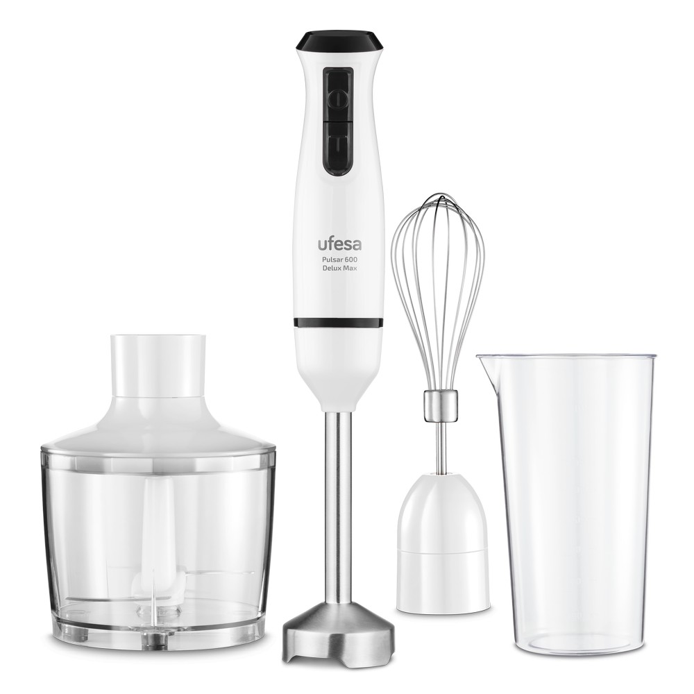 Ufesa 70105523. Tipo: Batidora de inmersión, Color del producto: Negro, Blanco. Capacidad del tazón: 0,6 L, Tipo de control: Botones. Potencia: 600 W, Fuente de energía: Corriente alterna. Ancho: 220 mm, Profundidad: 110 mm, Altura: 238 mm. No contiene: Bisfenol A (BPA)