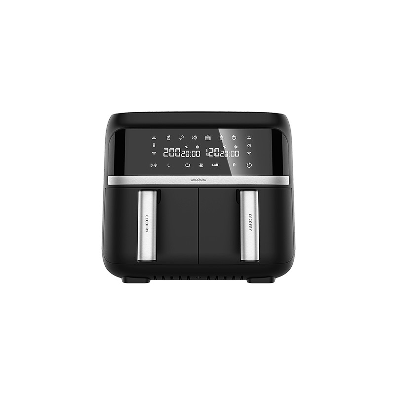 Cecotec 04338. Tipo de producto: Freidora de aire caliente, Capacidad: 9 L, Temperatura (min): 80 °C. Tipo de construcción: Doble, Color del producto: Negro, Tipo de control: Tocar. Potencia: 2850 W, Voltaje de entrada AC: 220-240 V, Frecuencia de entrada AC: 50/60 Hz. Ancho: 370 mm, Profundidad: 145 mm, Altura: 310 mm