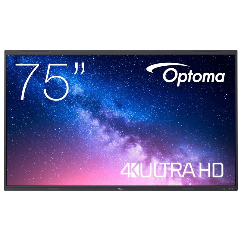 Optoma 5753RK. Diagonal de la pantalla: 190,5 cm (75), Brillo de pantalla: 420 cd / m², Resolución de la pantalla: 3840 x 2160 Pixeles. Sistema operativo instalado: Android 13, Arquitectura del procesador: ARM Cortex A76 + ARM Cortex A55, Memoria del usuario: 64 GB. Potencia de altavoz: 18 W. Wi-Fi estándares: 802.11a, 802.11b, 802.11g, Wi-Fi 4 (802.11n), Wi-Fi 5 (802.11ac), Wi-Fi 6 (802.11ax). Interfaz de panel de montaje: 800 x 400 mm
