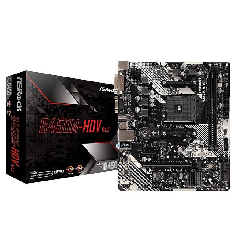 Asrock B450M-HDV R4.0. Fabricante de procesador: AMD, Socket de procesador: Zócalo AM4, Procesador compatible: AMD Athlon, AMD Ryzen™ 3, 2nd Generation AMD Ryzen™ 3, 3rd Generation AMD Ryzen™ 3, AMD…. tipos de memoria compatibles: DDR4-SDRAM, Memoria interna máxima: 32 GB, Tipo de ranuras de memoria: DIMM. Interfaces de disco de almacenamiento soportados: M.2, PCI Express 3.0, SATA III, Tipos de unidades de almacenamiento admitidas: HDD & SSD, Niveles RAID: 0, 1, 10. Graphics chipset: AMD, Máxima resolución: 4096 x 2160 Pixeles. Tipo de interfaz ethernet: Gigabit Ethernet, Controlador LAN: Realtek RTL8111H