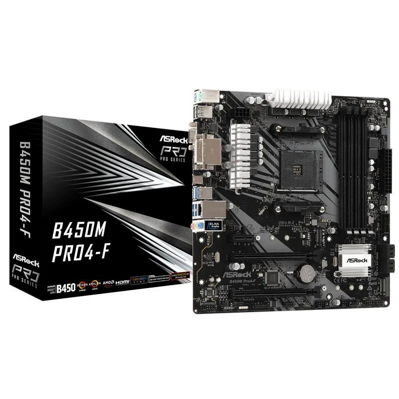 Asrock B450M Pro4 R2.0. Fabricante de procesador: AMD, Socket de procesador: Zócalo AM4, Procesador compatible: AMD Ryzen™ 3, AMD Ryzen™ 5, AMD Ryzen™ 7. tipos de memoria compatibles: DDR4-SDRAM, Memoria interna máxima: 128 GB, Tipo de ranuras de memoria: DIMM. Interfaces de disco de almacenamiento soportados: M.2, PCI Express 3.0, SATA III, Tipos de unidades de almacenamiento admitidas: HDD & SSD, Niveles RAID: 0, 1, 10. Soporte para proceso paralelo: CrossFireX, Quad-GPU CrossFireX, Graphics chipset: AMD, Máxima resolución: 4096 x 2160 Pixeles. Conector USB: USB tipo A, USB Tipo C