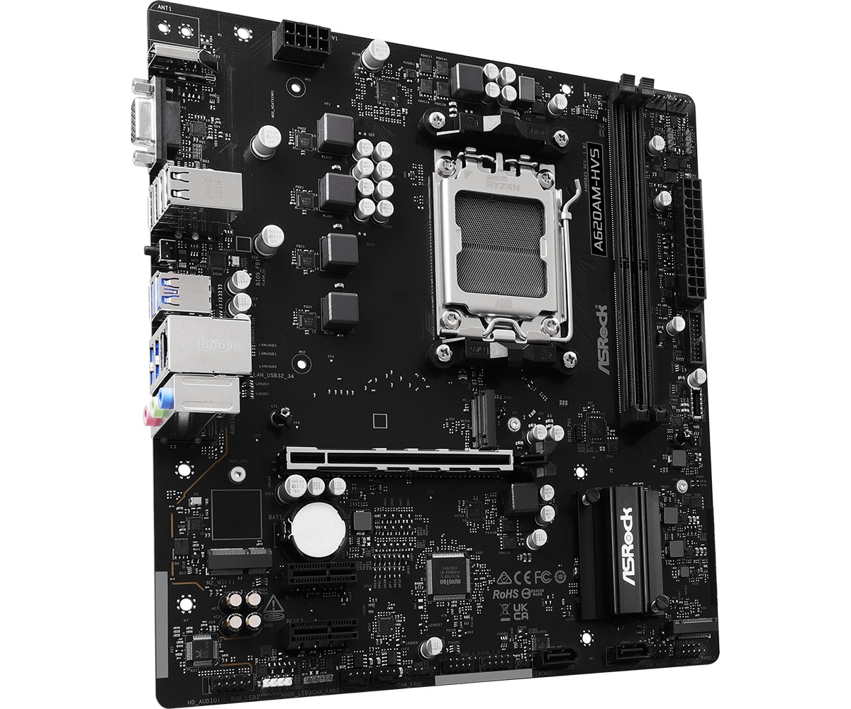 Asrock A620AM-HVS. Fabricante de procesador: AMD, Socket de procesador: Zócalo AM5, Procesador compatible: AMD Ryzen 7000 Series, AMD Ryzen 8000 Series, AMD Ryzen 9000 Series. tipos de memoria compatibles: DDR5-SDRAM, Memoria interna máxima: 128 GB, Tipo de ranuras de memoria: DIMM. Interfaces de disco de almacenamiento soportados: PCI Express 3.0, PCI Express 4.0, SATA III, Tipos de unidades de almacenamiento admitidas: HDD & SSD, Niveles RAID: 0, 1, 10. Máxima resolución: 3840 x 2160 Pixeles. Conector USB: USB tipo A