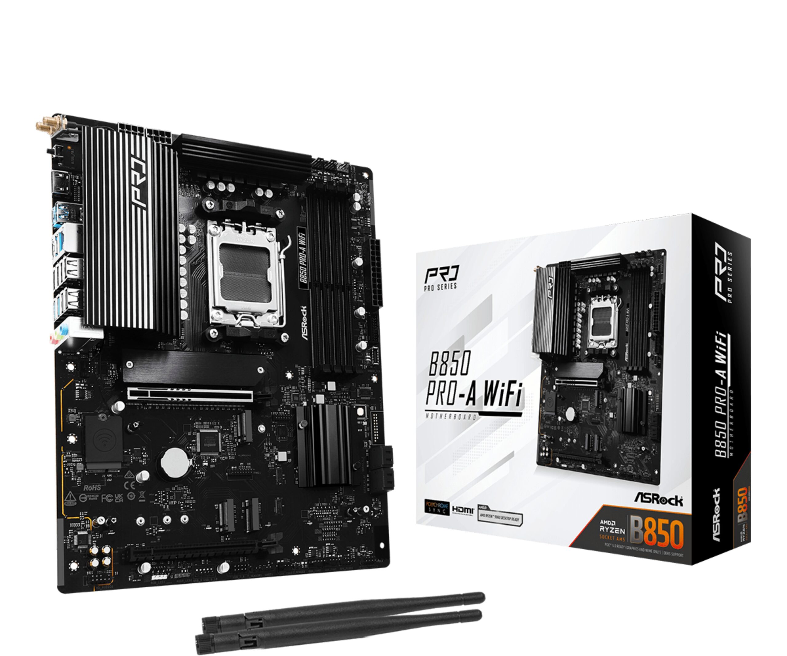 Asrock B850 Pro-A WiFi. Fabricante de procesador: AMD, Socket de procesador: Zócalo AM5, Procesador compatible: AMD Ryzen 7000 Series, AMD Ryzen 8000 Series, AMD Ryzen 9000 Series. tipos de memoria compatibles: DDR5-SDRAM, Memoria interna máxima: 256 GB, Tipo de ranuras de memoria: DIMM. Interfaces de disco de almacenamiento soportados: PCI Express 4.0, PCI Express 5.0, SATA III, Tipos de unidades de almacenamiento admitidas: HDD & SSD, Niveles RAID: 0, 1, 10. Máxima resolución: 3840 x 2160 Pixeles. Conector USB: USB tipo A, USB Tipo C
