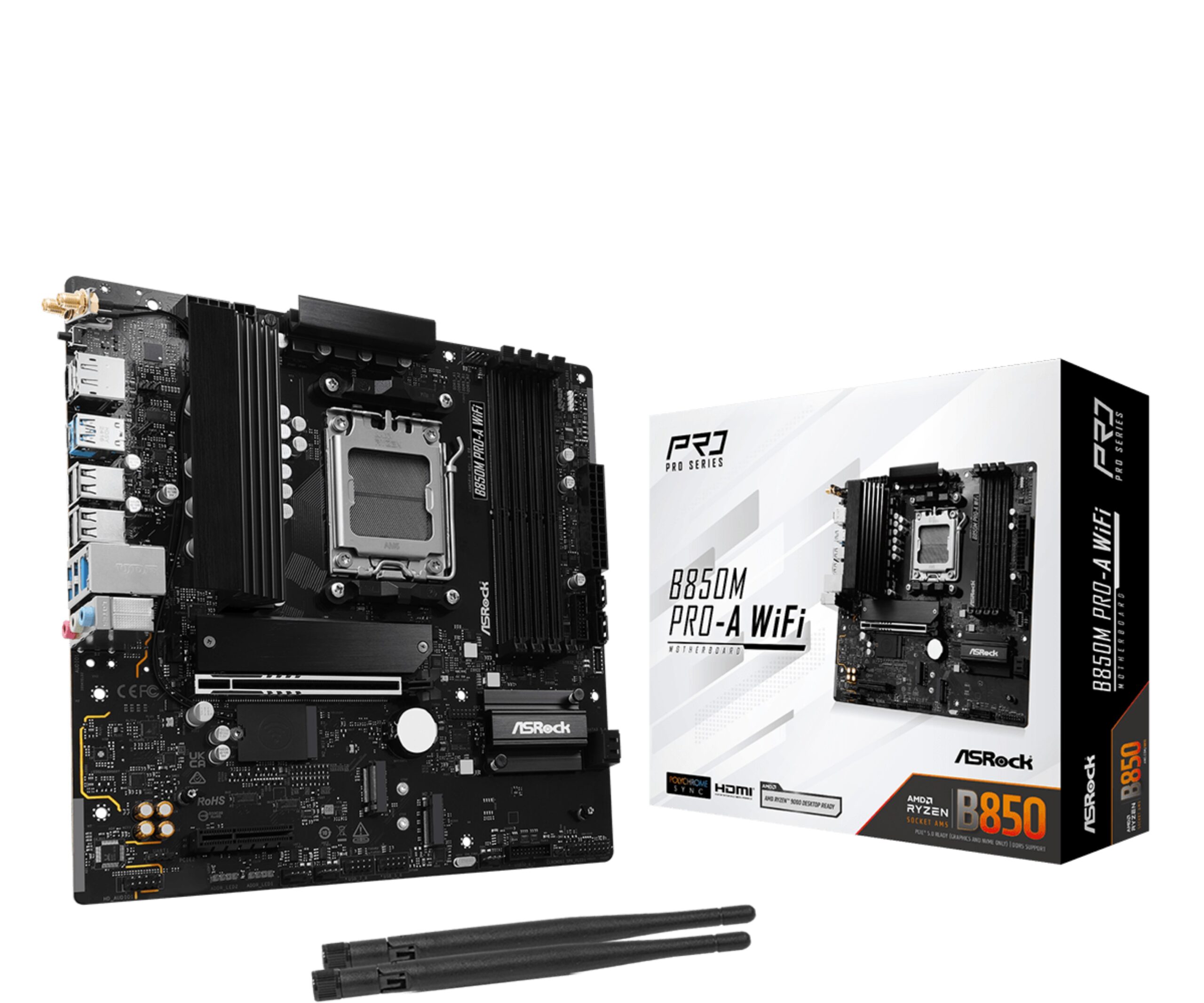 Asrock B850M Pro-A WiFi. Fabricante de procesador: AMD, Socket de procesador: Zócalo AM5, Procesador compatible: AMD Ryzen 7000 Series, AMD Ryzen 8000 Series, AMD Ryzen 9000 Series. tipos de memoria compatibles: DDR5-SDRAM, Memoria interna máxima: 256 GB, Tipo de ranuras de memoria: DIMM. Interfaces de disco de almacenamiento soportados: PCI Express 4.0, PCI Express 5.0, SATA III, Tipos de unidades de almacenamiento admitidas: HDD & SSD, Niveles RAID: 0, 1, 10. Máxima resolución: 3840 x 2160 Pixeles. Conector USB: USB tipo A, USB Tipo C