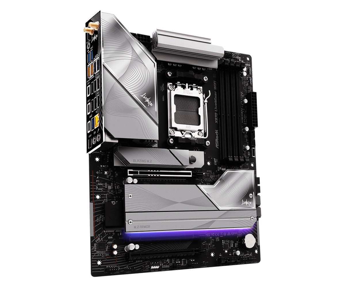 Asrock X870 LiveMixer WiFi. Fabricante de procesador: AMD, Socket de procesador: Zócalo AM5, Procesador compatible: AMD Ryzen 7000 Series, AMD Ryzen 8000 Series, AMD Ryzen 9000 Series. tipos de memoria compatibles: DDR5-SDRAM, Memoria interna máxima: 256 GB, Tipo de ranuras de memoria: DIMM. Interfaces de disco de almacenamiento soportados: PCI Express 4.0, PCI Express 5.0, SATA III, Tipos de unidades de almacenamiento admitidas: HDD & SSD, Niveles RAID: 0, 1, 10. Máxima resolución: 7680 x 4320 Pixeles. Conector USB: USB tipo A, USB Tipo C