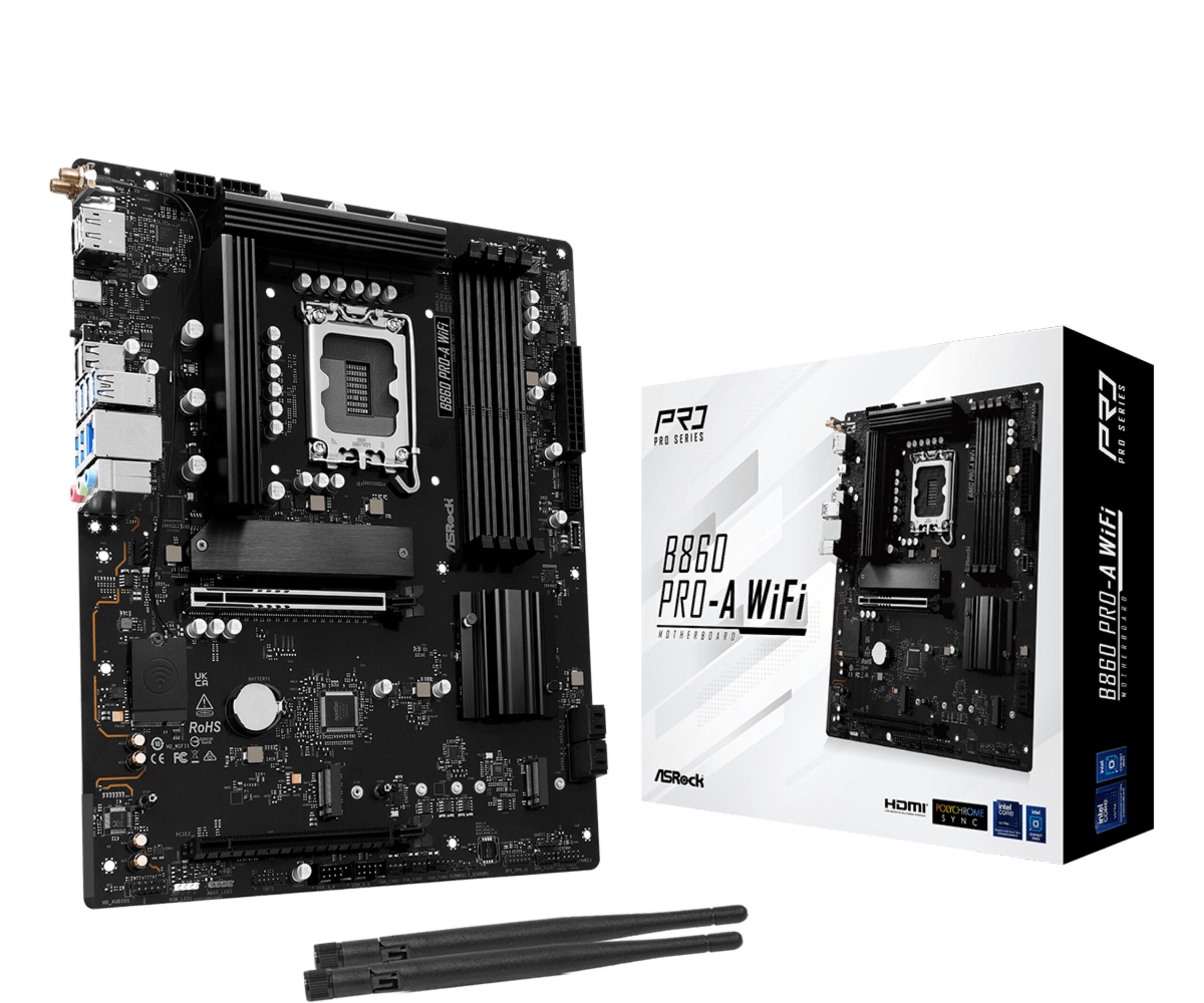 Asrock B860 Pro-A WiFi. Fabricante de procesador: Intel, Socket de procesador: LGA 1851 (Socket V1). tipos de memoria compatibles: DDR5-SDRAM, Memoria interna máxima: 256 GB, Tipo de ranuras de memoria: DIMM. Interfaces de disco de almacenamiento soportados: M.2, SATA III, Niveles RAID: 0, 1, 5, 10. Graphics chipset: Intel. Tipo de interfaz ethernet: 2.5 Gigabit Ethernet, Controlador LAN: Dragon RTL8125BG, Estándar Wi-Fi: Wi-Fi 6E (802.11ax)