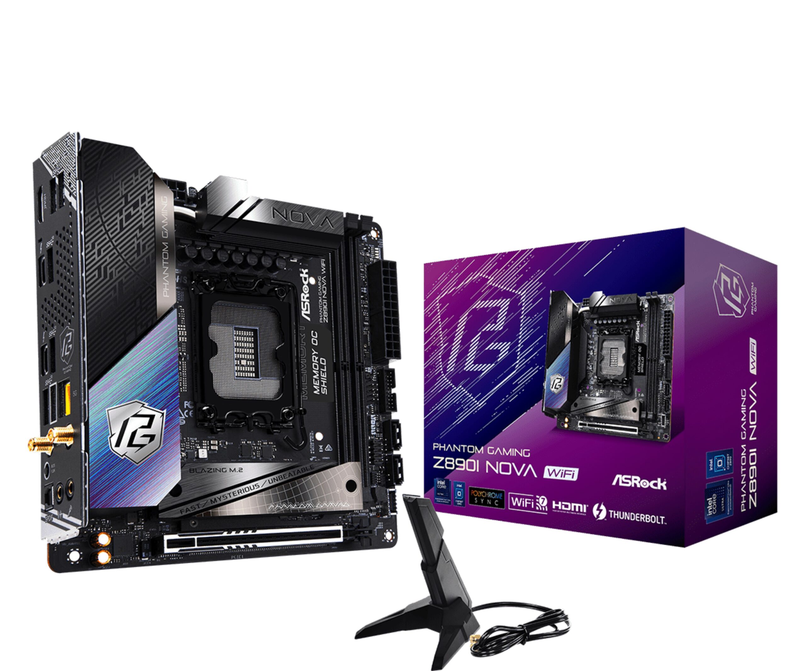 Asrock Phantom Gaming Z890I Nova WiFi. Fabricante de procesador: Intel, Socket de procesador: LGA 1851 (Socket V1), Procesador compatible: Intel Core Ultra (Series 2). tipos de memoria compatibles: DDR5-SDRAM, Memoria interna máxima: 128 GB, Tipo de ranuras de memoria: DIMM. Interfaces de disco de almacenamiento soportados: PCI Express 4.0, PCI Express 5.0, SATA III, Tipos de unidades de almacenamiento admitidas: HDD & SSD, Niveles RAID: 0, 1, 5, 10. Máxima resolución: 7680 x 4320 Pixeles. Conector USB: USB tipo A, USB Tipo C