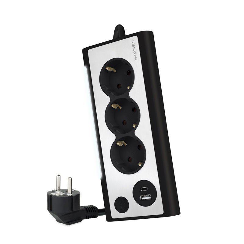 Nanocable Regleta de Sobremesa con 3 Tomas de Tierra y 2 USB´s con Luz, Negro. Longitud de cable: 1,5 m, Colocación soportada: Interior, Tipo de salida AC: Tipo F. Cantidad de salidas AC: 3 salidas AC. Voltaje de entrada AC: 230 V, Frecuencia de entrada AC: 50 Hz, Máxima corriente: 3 A. Número de productos incluidos: 1 pieza(s), Tipo de embalaje: Caja, Ancho del paquete: 110 mm