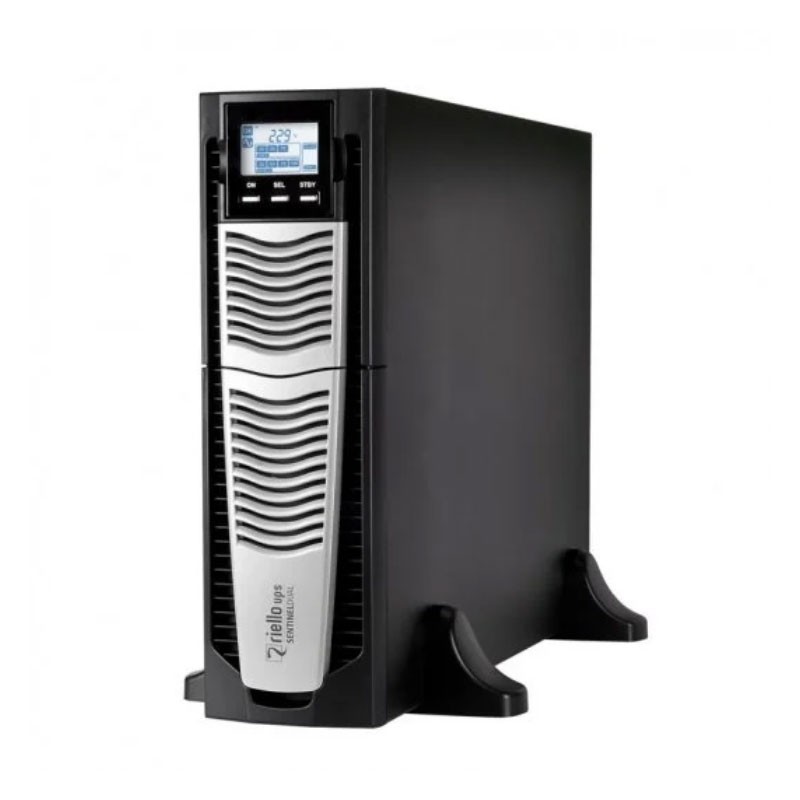 Riello Sentinel Dual. Topología UPS: Doble conversión (en línea), Capacidad de potencia de salida (VA): 4 kVA, Potencia de salida: 3600 W. Tipo de salida AC: IEC 320, Cantidad de salidas AC: 3 salidas AC, Tipo de puerto USB: USB tipo A. Tecnología de batería: Sealed Lead Acid (VRLA), Voltaje de la pila: 96 V, Tiempo de recarga de la batería: 4 h. Factor de forma: Montaje en rack/Torre o Montaje en bastidor/Torre, Color del producto: Negro, Capacidad del rack: 3U. Ancho: 131 mm, Profundidad: 640 mm, Altura: 448 mm