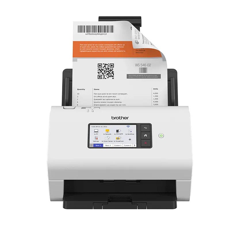 Brother ADS-4900W. Tamaño máximo de escaneado: 215,9 x 355,6 mm, Resolución óptica de escáner: 600 x 600 DPI, Resolución de escaneado mejorada: 1200 x 1200 DPI. Tipo de escaneado: Escáner con alimentador automático de documentos (ADF), Color del producto: Negro, Blanco, Tipo de control: Botones, Tocar. Tipo de sensor: Dual CIS, Escanear a: E-mail Server, FTP, HTTP, PC, SMB, Controladores de escaneado: ISIS, SANE. Capacidad del alimentador automático de documentos: 100 hojas. Tamaño máximo de papel ISO A-series: A4, Tipos de media soportados de escaneo: Tarjeta de visita, Papel normal, Tarjeta de plástico, Papel reciclado, Papel grueso, Papel fino, Peso del papel en Alimentador de Documentos Automático: 25 – 413 g/m²
