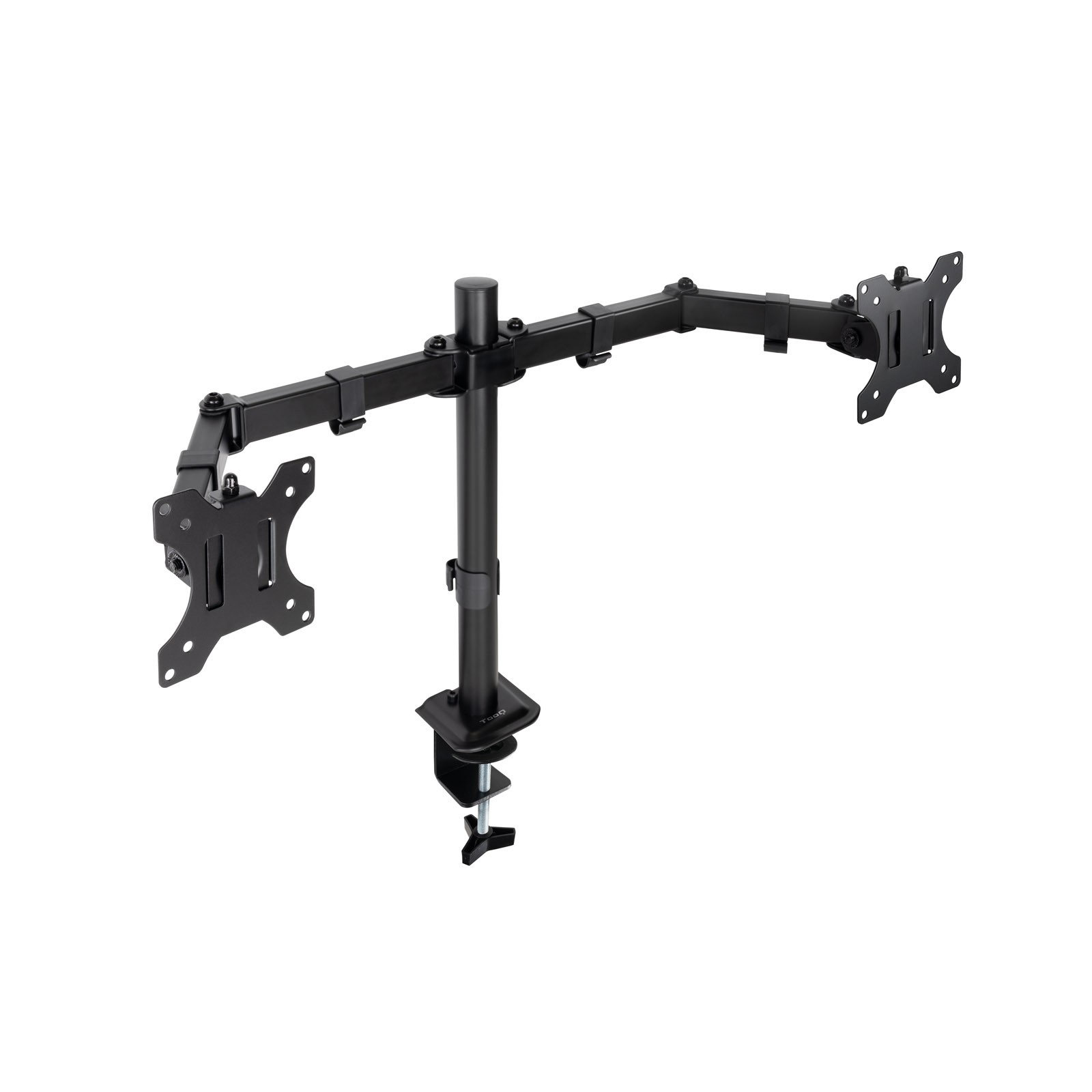 TooQ Soporte de Mesa para 2 Pantallas 17-27, Negro. Montaje: Abrazadera/Atornillado, Capacidad máxima de peso: 16 kg, Tamaño mínimo de pantalla: 43,2 cm (17), Tamaño máximo de pantalla: 68,6 cm (27), Compatibilidad con interfaz de montaje (min): 75 x 75 mm, Compatibilidad con interfaz de montaje (max): 100 x 100 mm. Ajustes de altura, Ángulo de giro (alcance): -90 – 90°, Ángulo de inclinación: -45 – 45°. Color del producto: Negro
