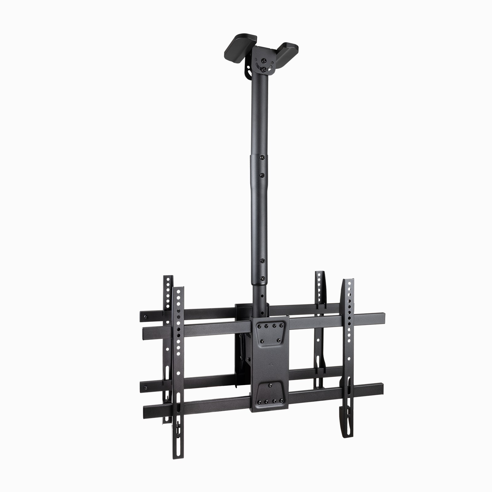 TooQ Soporte de Techo para 2 Pantallas 43-86, Negro. Capacidad máxima de peso: 100 kg, Tamaño mínimo de pantalla: 109,2 cm (43), Tamaño máximo de pantalla: 2,18 m (86), Compatibilidad con interfaz de montaje (min): 200 x 200 mm, Compatibilidad con interfaz de montaje (max): 600 x 400 mm. Rango de ajustes de altura: 485 – 925 mm, Ángulo de inclinación: -20 – 5°, Ángulo de giro (alcance): -180 – 180°. Color del producto: Negro