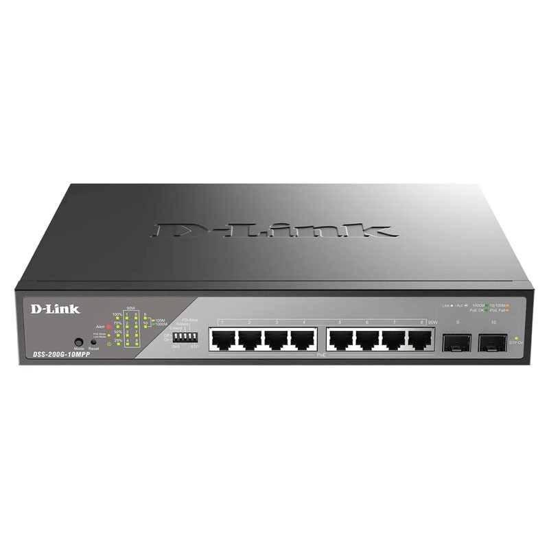 D-Link DSS-200G-10MPP. Tipo de interruptor: Gestionado, Capa del interruptor: L2. Puertos tipo básico de conmutación RJ-45 Ethernet: Gigabit Ethernet (10/100/1000), Cantidad de puertos básicos de conmutación RJ-45 Ethernet: 10, Número de módulos SFP instalados: 2. Bidireccional completo (Full duplex). Tabla de direcciones MAC: 8000 entradas, Capacidad de conmutación: 20 Gbit/s. Estándares de red: IEEE 802.3, IEEE 802.3ab, IEEE 802.3ad, IEEE 802.3af, IEEE 802.3at, IEEE 802.3az, IEEE 802.3bt,…. Energía sobre Ethernet (PoE). Montaje en rack, Factor de forma: 1U
