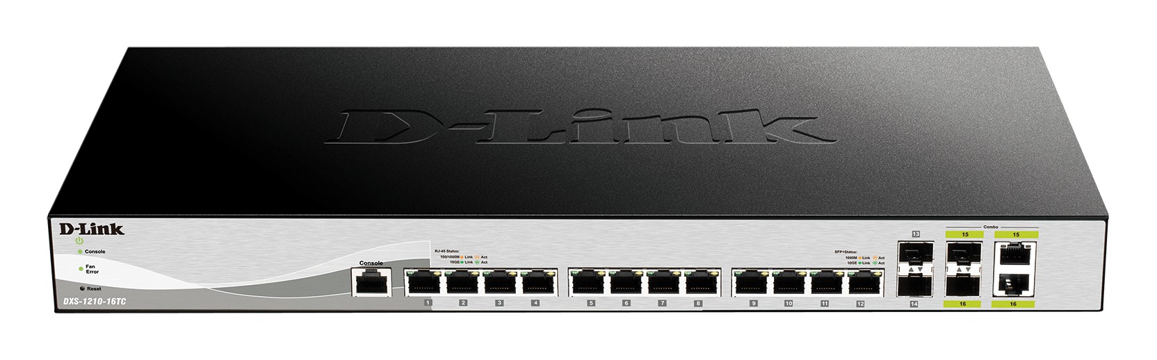 D-Link DXS-1210-16TC/E. Tipo de interruptor: Gestionado, Capa del interruptor: L2. Puertos tipo básico de conmutación RJ-45 Ethernet: 10G Ethernet (100/1000/10000), Cantidad de puertos básicos de conmutación RJ-45 Ethernet: 12. Tabla de direcciones MAC: 16000 entradas, Capacidad de conmutación: 320 Gbit/s. Estándares de red: IEEE 802.1D, IEEE 802.1Q, IEEE 802.1s, IEEE 802.1w, IEEE 802.1x, IEEE 802.3ab, IEEE 802.3ad, IEEE…. Conector eléctrico: Conector de alimentación AC-in. Montaje en rack