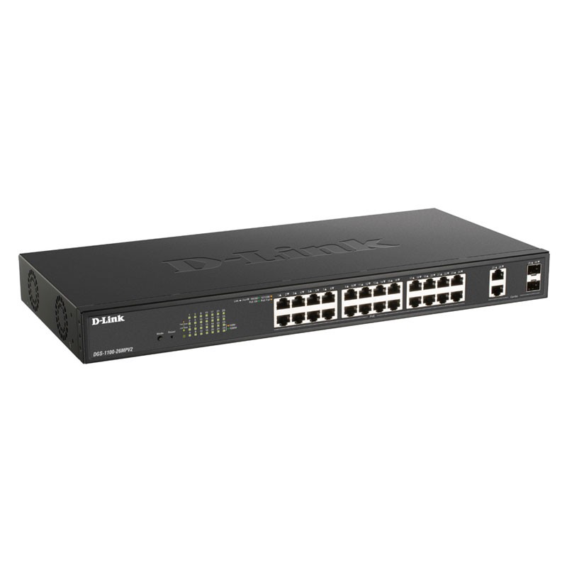 D-Link DGS-1100-26MPV2/E. Tipo de interruptor: Gestionado, Capa del interruptor: L2. Puertos tipo básico de conmutación RJ-45 Ethernet: Gigabit Ethernet (10/100/1000), Cantidad de puertos básicos de conmutación RJ-45 Ethernet: 24. Bidireccional completo (Full duplex). Tabla de direcciones MAC: 8000 entradas, Capacidad de conmutación: 52 Gbit/s. Estándares de red: IEEE 802.1D, IEEE 802.1w, IEEE 802.3af, IEEE 802.3at. Energía sobre Ethernet (PoE). Montaje en rack