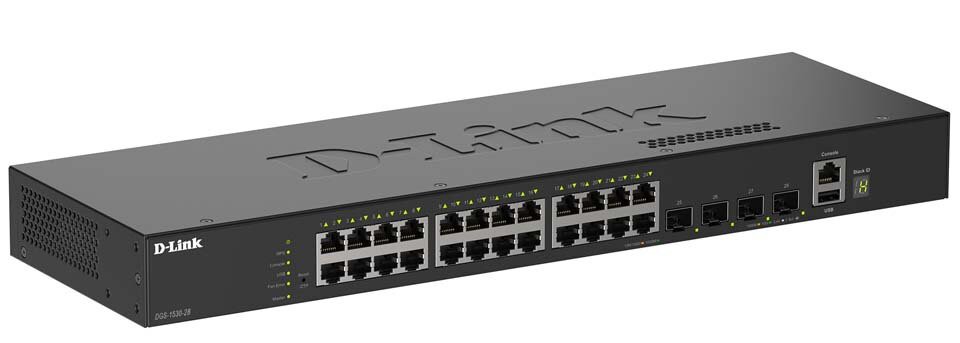 D-Link DGS-1530-28/E. Tipo de interruptor: Gestionado, Capa del interruptor: L2. Puertos tipo básico de conmutación RJ-45 Ethernet: Gigabit Ethernet (10/100/1000), Cantidad de puertos básicos de conmutación RJ-45 Ethernet: 24, Cantidad de puertos USB 2.0: 1, Puerto de consola: RJ-45. Bidireccional completo (Full duplex). Tabla de direcciones MAC: 16000 entradas, Capacidad de conmutación: 128 Gbit/s. Estándares de red: IEEE 802.3, IEEE 802.3ab, IEEE 802.3ae, IEEE 802.3u, IEEE 802.3x. Montaje en rack