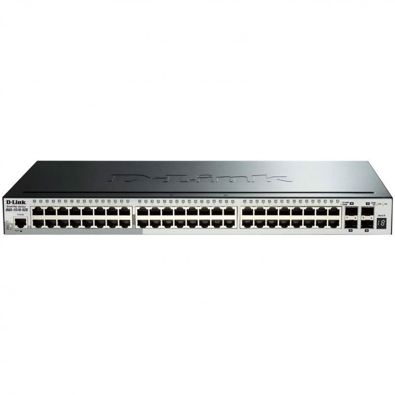 D-Link DGS-1510-52X. Tipo de interruptor: Gestionado, Capa del interruptor: L3. Puertos tipo básico de conmutación RJ-45 Ethernet: Gigabit Ethernet (10/100/1000), Cantidad de puertos básicos de conmutación RJ-45 Ethernet: 48. Bidireccional completo (Full duplex). Tabla de direcciones MAC: 16000 entradas, Capacidad de conmutación: 176 Gbit/s. Estándares de red: IEEE 802.3, IEEE 802.3ab, IEEE 802.3ae, IEEE 802.3u, IEEE 802.3x. Conector eléctrico: Toma de entrada de CC. Montaje en rack, Factor de forma: 1U