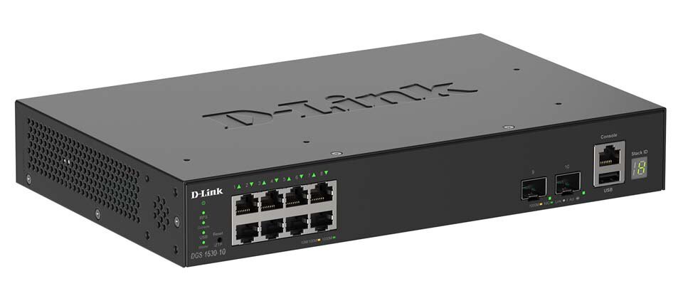 D-Link DGS-1530-10. Tipo de interruptor: Gestionado, Capa del interruptor: L2. Puertos tipo básico de conmutación RJ-45 Ethernet: Gigabit Ethernet (10/100/1000), Cantidad de puertos básicos de conmutación RJ-45 Ethernet: 8, Puerto de consola: RJ-45. Bidireccional completo (Full duplex). Tabla de direcciones MAC: 16000 entradas, Capacidad de conmutación: 56 Gbit/s. Estándares de red: IEEE 802.3, IEEE 802.3ab, IEEE 802.3ae, IEEE 802.3u, IEEE 802.3x