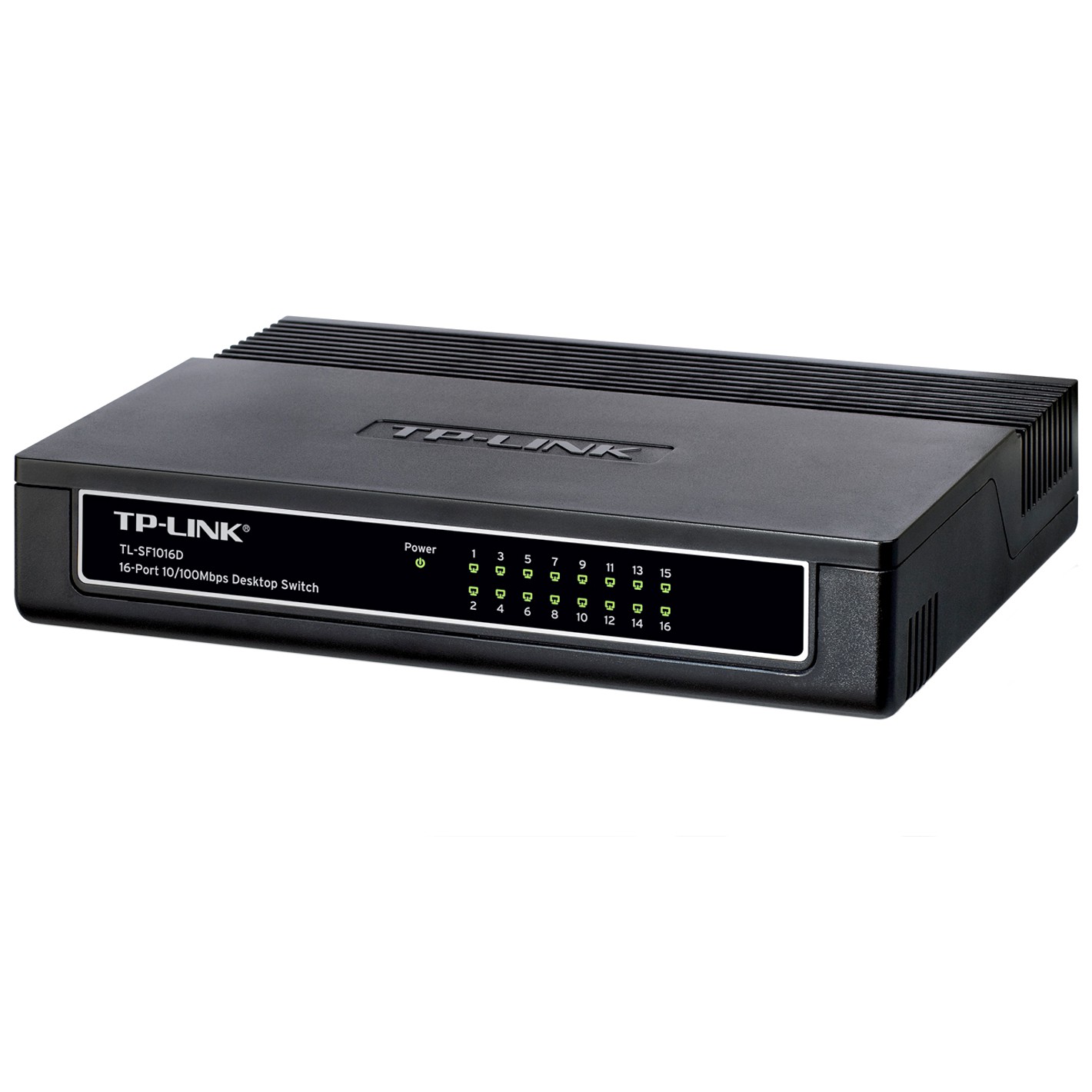 TP-LINK 16-Port 10/100Mbps Desktop Switch. Tipo de interruptor: No administrado. Cantidad de puertos básicos de conmutación RJ-45 Ethernet: 16. Bidireccional completo (Full duplex). Tabla de direcciones MAC: 1000 entradas, Capacidad de conmutación: 3,2 Gbit/s. Estándares de red: IEEE 802.3u,IEEE 802.3x. Conector eléctrico: Toma de entrada de CC