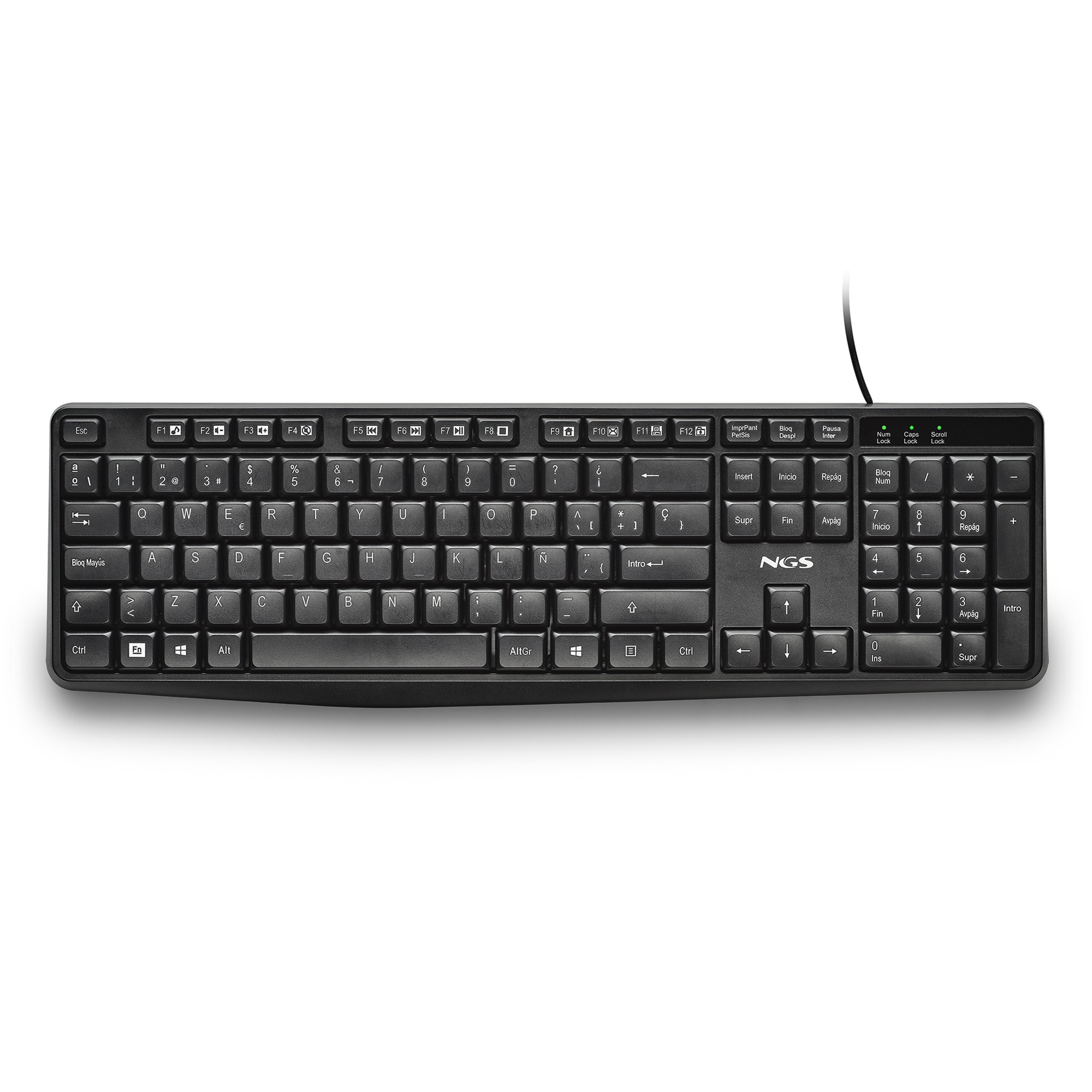 NGS FUNKY V4 (QUERTY, ES). Formato del teclado: Completo (100%). Estilo de teclado: Derecho. Tecnología de conectividad: Alámbrico, Interfaz del dispositivo: USB, Diseño de teclado: QWERTY. Longitud de cable: 1,5 m. Uso recomendado: Hogar / Oficina. Color del producto: Negro
