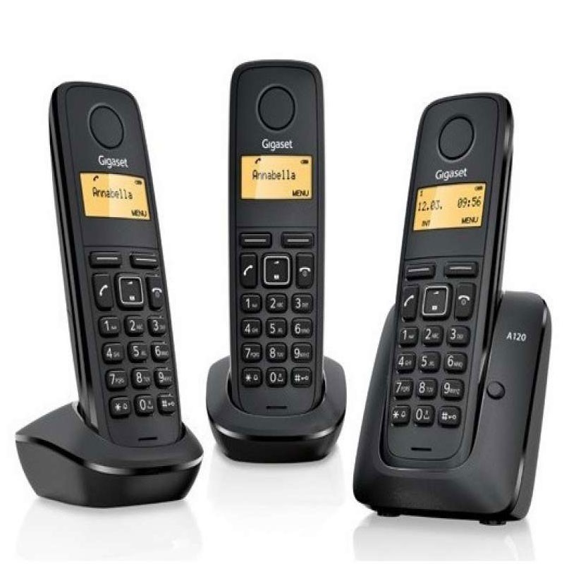Gigaset A170 Trio. Tipo: Teléfono DECT/analógico, Tipo de auricular: Terminal inalámbrico, Rango máximo en interiores: 50 m, Rango máximo en exteriores: 300 m. Capacidad de lista de direcciones: 50 entradas. Identificador de llamadas. Diagonal de la pantalla: 3,81 cm (1.5). Color del producto: Negro. Número de teléfonos móviles incluidos: 3