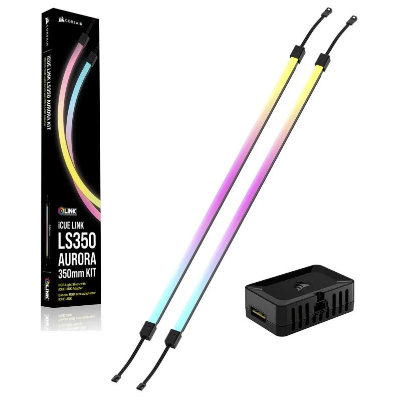 Corsair iCUE LINK LS350 Aurora. Tipo: Tira LED, Color del producto: Negro, Color de luz: Multicolor. Ancho: 10 mm, Profundidad: 350 mm, Altura: 10 mm. Cantidad por paquete: 2 pieza(s), Tipo de embalaje: Caja