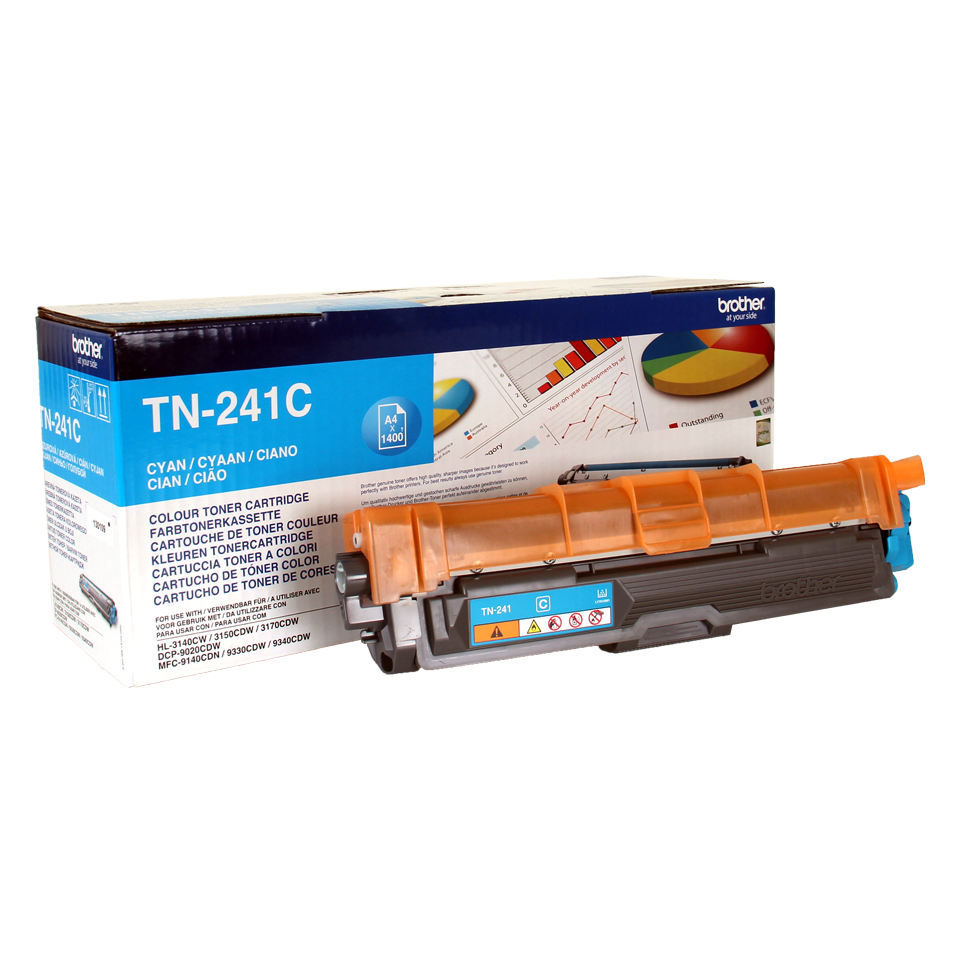 Brother TN-241C. Tipo: Cartucho de tóner, Producción de papel: 1400 páginas, Colores de impresión: Cian, Cantidad por paquete: 1 pieza(s)